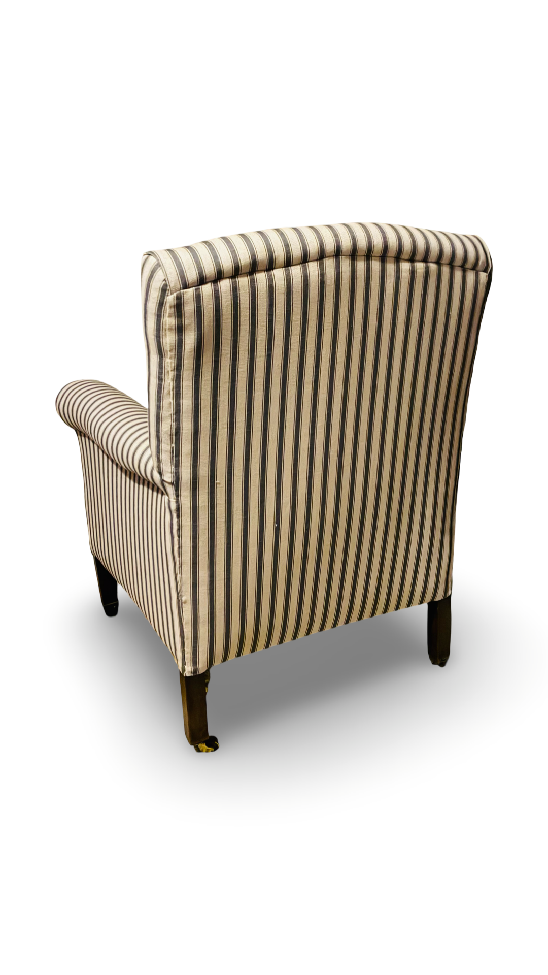Elegant armchair, fully restored and covered with striped blue linen ticking fabric.